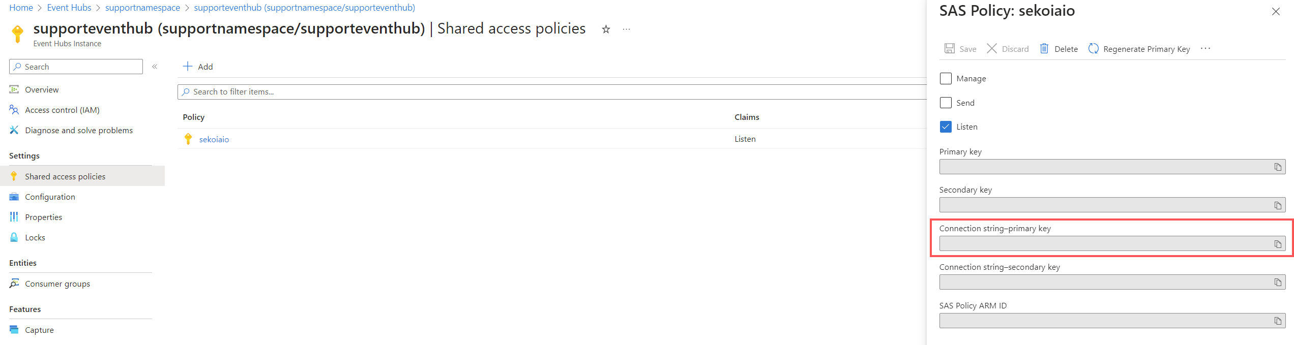 Step 4: Create “Shared Access Policies” for the Event Hub