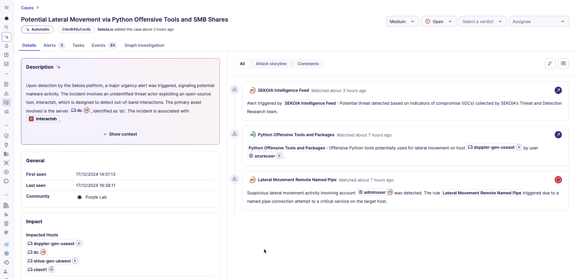 AI Cases automatically processes security alerts and creates cases based on related incidents. Each case includes: