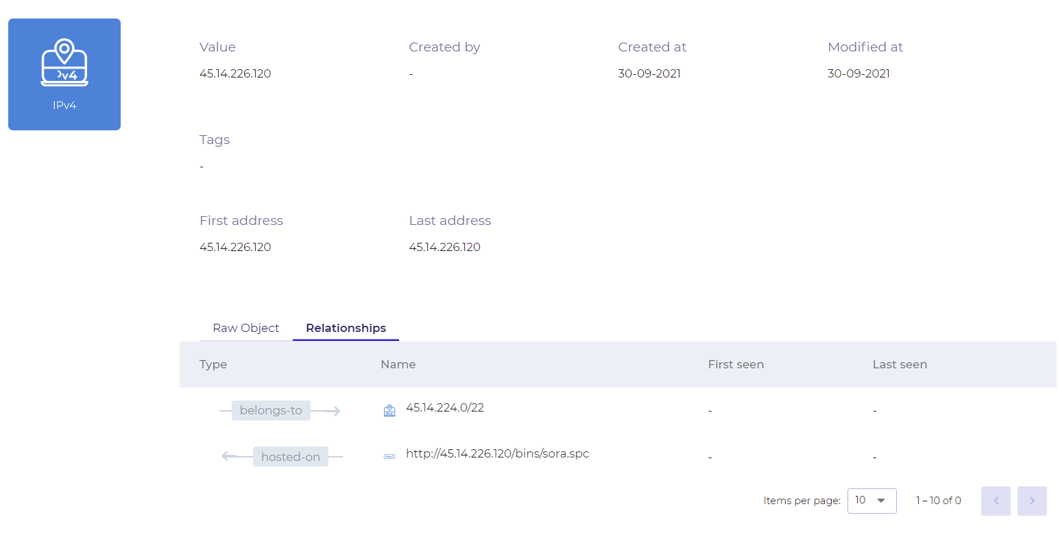 When clicking on an Observable, a dedicated page will display information, raw object and sometimes relationships as shown bellow: