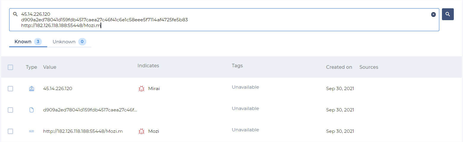In the Known tab you will find observables known in the Intelligence Center and some context over it if there is some. The Unknown tab will contain the observables never seen in the Intelligence Center.